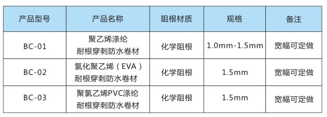 BC化學阻根耐根穿刺防水卷材是以高分子片 材(聚乙烯、氯化聚乙烯,聚氯乙烯,EVA )為胎基,以添加進口化學阻根劑,通過特殊的擠出工藝,通過對雙面材料,高分子體系的防阻根處理,從根本上阻止了植物根尖穿透防水層,同時不影響植物的生長,確保植物根尖對防水層的不破壞,是建筑種植綠化優選的耐根穿刺防水材料。